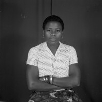 100. EAP054/1/39/100 Reference (shelfmark): EAP054/1/39/100 Title: Recreational photograph [c 1984] Scope & Content: Woman standing hand to chin Format of original: 59mm x 59mm plastic negative Collection Area: Endangered Archives Programme Languages: Not applicable Date Range: c 1984 Extent: 1 TIFF image