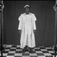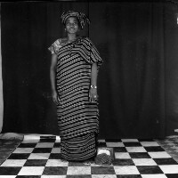 3 people: man sitting in a suit, right foot crossed over his left, hands on his right foot, one woman standing on his right wearing skirt and white blouse, handbag on her right shoulder, the other woman wearing a "pagne" dress with a black handbag on her left shoulder. Format of original: 59mm...