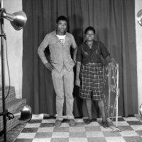 109. EAP054/1/46/109 Reference (shelfmark): EAP054/1/46/109 Title: Recreational photograph [c 1984 - 1985] Scope & Content: Man with hands on hips and woman on his left, her left hand on an iron grillwork. Format of original: 59mm x 59mm plastic negative Collection Area: Endangered Archives Programme Languages: Not applicable Date Range: 1984-1985 Extent: 1 TIFF image