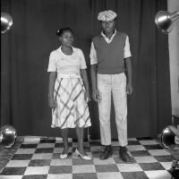 209. EAP054/1/46/209 Reference (shelfmark): EAP054/1/46/209 Title: Recreational photograph [c 1984 - 1985] Scope & Content: Girl with hands in pockets of her sleeveless safari jacket, man with left hand on hip. Format of original: 59mm x 59mm plastic negative Collection Area: Endangered Archives Programme Languages: Not applicable Date Range: 1984-1985 Extent: 1 TIFF image