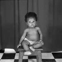 Women from Mbouda standing in dark "pagne" dress, handbag in right hand, between 2 tied back curtains. Format of original: 59mm x 59mm plastic negative