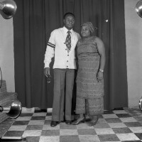 Two people standing: man with left arm around a woman, glasses in his right hand; the man is from Babadjou (Kombou). Format of original: 59mm x 59mm plastic negative