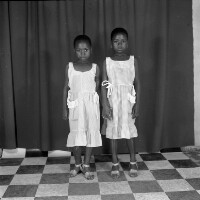 Man standing, in dark trousers with white stripes and a short-sleeved shirt, between 2 tied back curtains. Format of original: 59mm x 59mm plastic negative