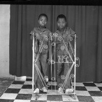 493. EAP054/1/46/493 Reference (shelfmark): EAP054/1/46/493 Title: Recreational photograph [c 1984 - 1985] Scope & Content: 2 twins in matching outfits, each with a hand on an iron grillwork, and holding hands. Format of original: 59mm x 59mm plastic negative Collection Area: Endangered Archives Programme Languages: Not applicable Date Range: 1984-1985 Extent: 1 TIFF image