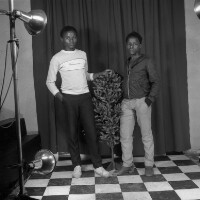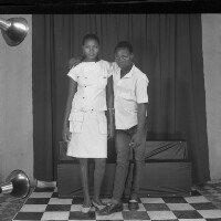 2 friends from Mbouda standing, woman in white dress and shoes, boy in white shirt and dark trousers, his arm around her shoulders. Format of original: 59mm x 59mm plastic negative