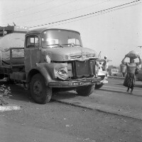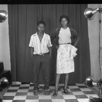 Woman from Bamesso standing, son next to her, she in white T-shirt and patterned skirt, scarf on her head, son in safari suit. Format of original: 59mm x 59mm plastic negative