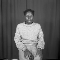 Girl from Batcham standing, right hand on a plastic tree next to her, left hand on hip, earrings, strap sandals. Format of original: 59mm x 59mm plastic negative