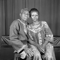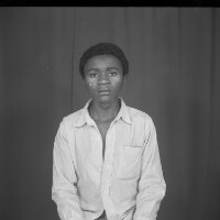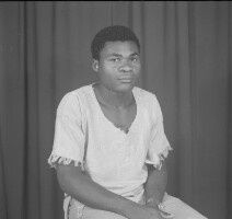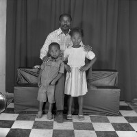 Man from Bamendjinda with 2 children, he is sitting and they are standing in front of him, girl with hand on hip, in white, boy in safari suit. Format of original: 59mm x 59mm plastic negative