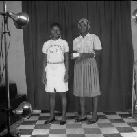 406. EAP054/1/47/406 Reference (shelfmark): EAP054/1/47/406 Title: Recreational photograph [c 1985 - 1986] Scope & Content: 2 young women from Bamesso standing: one in white outfit, dark shoes, earrings, the other in white top and pleated skirt, dark shoes, holding something in her hands. Format of original: 59mm x 59mm plastic negative Collection Area: Endangered Archives Programme Languages: Not applicable Date Range: 1985-1986 Extent: 1 TIFF image