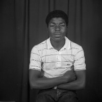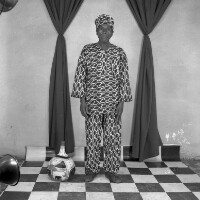Couple from Bamendjinda standing, man in dark trousers, leather jacket and hat, hand on his wifes shoulder, woman in white T-shirt and pleated darker skirt. Format of original: 59mm x 59mm plastic negative