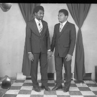 2 young male friends from Mbouda standing: the first in white short-sleeved shirt and traditional hat with white tennis shoes, the second in a cap, left hand on hip, sandals. Format of original: 59mm x 59mm plastic negative