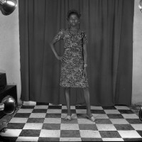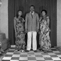 Man from Bamesso standing, flanked by his 2 wives in "pagne" dresses, one with plaited hair, man in jacket and dark trousers. Format of original: 59mm x 59mm plastic negative