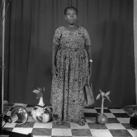 469. EAP054/1/47/469 Reference (shelfmark): EAP054/1/47/469 Title: Recreational photograph [c 1985 - 1986] Scope & Content: Woman from Babete standing, a gourd on each side (one decorated), bag in her left hand. Format of original: 59mm x 59mm plastic negative Collection Area: Endangered Archives Programme Languages: Not applicable Date Range: 1985-1986 Extent: 1 TIFF image