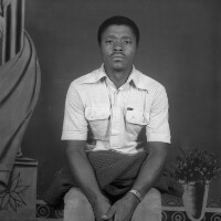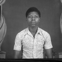 Child from Babete standing, white socks and jacket, plastic tree behind, many pictures on the walls, some of men in 'gandoura' gowns. Format of original: 59mm x 59mm plastic negative