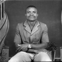 Reproduction woman from Babete sitting on a stool, horse tail fly whisk on her knees, white shoes, handbag between her feet. [platform shoes, radio, backcloth] Format of original: 59mm x 59mm plastic negative