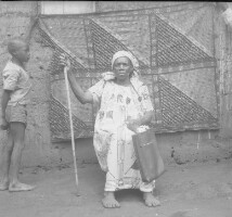 33. EAP054/1/50/33 Reference (shelfmark): EAP054/1/50/33 Title: Recreational photograph [c 1980] Scope & Content: Woman sitting, cane in right hand, bag in left hand, boy looking on on her right. [cloth backdrop] Format of original: 55mm x 59mm plastic negative Collection Area: Endangered Archives Programme Languages: Not applicable Date Range: c 1980 Extent: 1 TIFF image