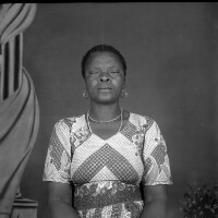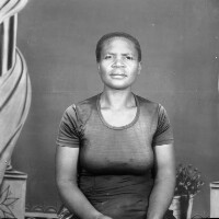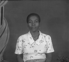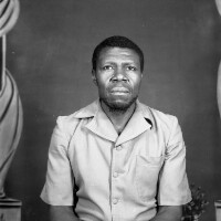 Man from Bagam standing, white T-shirt and pullover, dark trousers and shoes, traditional Bamileke hat. Format of original: 59mm x 59mm plastic negative