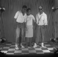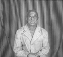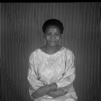 Photo of record: at that time disabled people were required to have themselves photographed in order to be spared from paying tax at the town hall, like other people; child sitting on a stool, chain around neck, front view [etiolated legs]. Format of original: 59mm x 59mm plastic negative
