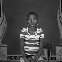 Young woman from Bangang sitting in a black and white armchair, legs crossed, right hand on left ankle, reading a book. [elaborate plaits] Format of original: 59mm x 59mm plastic negative