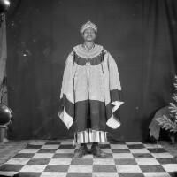 159. EAP054/1/94/159 Reference (shelfmark): EAP054/1/94/159 Title: Recreational photograph [c 1970-c 1995] Scope & Content: Man from Mbouda standing in traditional Bamileke dress. Format of original: 59mm x 59mm plastic negative Collection Area: Endangered Archives Programme Languages: Not applicable Date Range: c 1970-c 1995 Extent: 1 TIFF image