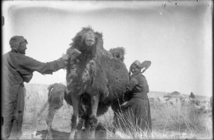 110. EAP264/1/8/6/110 Reference (shelfmark): EAP264/1/8/6/110 Title: A nomad woman milking a female camel (location unknown) [1930s] Collection Area: Endangered Archives Programme Languages: Not applicable Date Range: 1930s Extent: 1 TIFF image