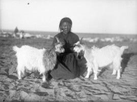 132. EAP264/1/8/6/132 Reference (shelfmark): EAP264/1/8/6/132 Title: A nomad girl tending baby goats (location unknown) [1930s] Collection Area: Endangered Archives Programme Languages: Not applicable Date Range: 1930s Extent: 1 TIFF image