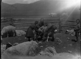 54. EAP264/1/8/6/54 Reference (shelfmark): EAP264/1/8/6/54 Title: Nomad children help their mother in clipping wool, Central Mongolia [1940s] Collection Area: Endangered Archives Programme Languages: Not applicable Date Range: 1940s Extent: 1 TIFF image