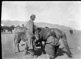 69. EAP264/1/8/6/69 Reference (shelfmark): EAP264/1/8/6/69 Title: A herdsman helping his wife in milking a mare (location unknown) [1940s] Collection Area: Endangered Archives Programme Languages: Not applicable Date Range: 1940s Extent: 1 TIFF image