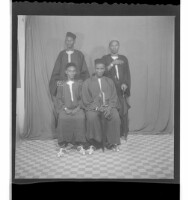 102. EAP449/2/10/102 Reference (shelfmark): EAP449/2/10/102 Title: Four men wearing boubous and hats; two sit in front and two stand behind in the studio. Collection Area: Endangered Archives Programme Languages: Not applicable Date Range: 2nd half od the 20th century Extent: 1 TIFF image