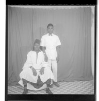 109. EAP449/2/10/109 Reference (shelfmark): EAP449/2/10/109 Title: A man wearing a boubou and hat sitting face-forward near a man wearing a shirt and pants standing face-forward in the studio. Collection Area: Endangered Archives Programme Languages: Not applicable Date Range: 2nd half od the 20th century Extent: 1 TIFF image