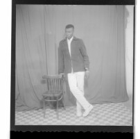 110. EAP449/2/10/110 Reference (shelfmark): EAP449/2/10/110 Title: A man wearing a shirt and pants standing, leaning on a chair, in profile in the studio. Collection Area: Endangered Archives Programme Languages: Not applicable Date Range: 2nd half od the 20th century Extent: 1 TIFF image