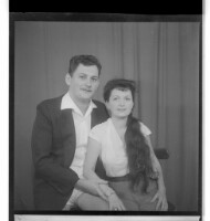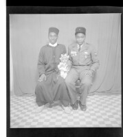 117. EAP449/2/10/117 Reference (shelfmark): EAP449/2/10/117 Title: A man wearing a jacket holding a woman wearing a shirt and pants, both sitting face-forward in the studio. Collection Area: Endangered Archives Programme Languages: Not applicable Date Range: 2nd half od the 20th century Extent: 1 TIFF image