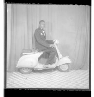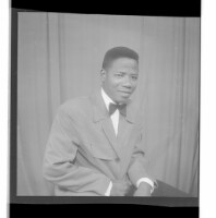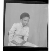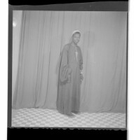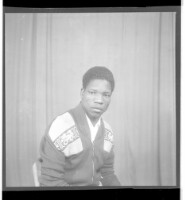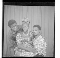 Three people: one woman wearing a dress and head wrap sitting in between two men wearing shirts, one sitting and the other leaning, both in profile in the studio.