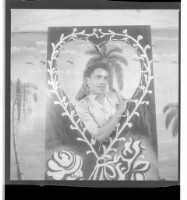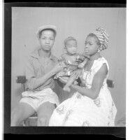 A man wearing a shirt, shorts, and hat sitting face-forward and a woman wearing a dress and head wrap sitting in profile, both holding a baby in the middle in the studio.