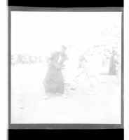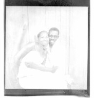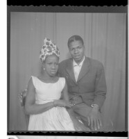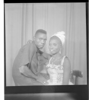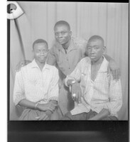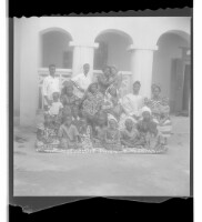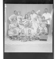 A woman in a dress, headscarf, and necklace standing facing forward holding a woman on her right in a dress, headscarf, and necklace sitting facing forward and a little girl in a dress standing in profile next to them in the studio.