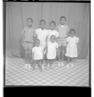 Photo of seven children, two little girls standing facing forward in front of five standing facing forward behind them, three of them girls and two boys.