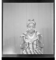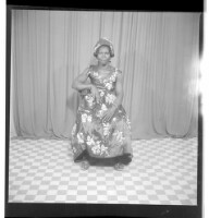 145. EAP449/2/12/145 Reference (shelfmark): EAP449/2/12/145 Title: A woman in a dress and headscarf sitting facing forward in the studio. Collection Area: Endangered Archives Programme Languages: Not applicable Date Range: 2nd half od the 20th century Extent: 1 TIFF image