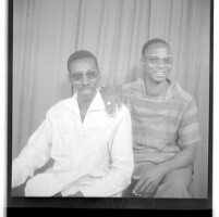 147. EAP449/2/12/147 Reference (shelfmark): EAP449/2/12/147 Title: Two men, one in a dress shirt and glasses sitting facing forward and the other in a t-shirt and glasses sitting facing forward in the studio. Collection Area: Endangered Archives Programme Languages: Not applicable Date Range: 2nd half od the 20th century Extent: 1 TIFF image