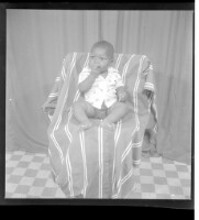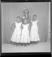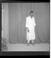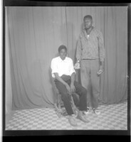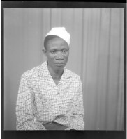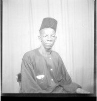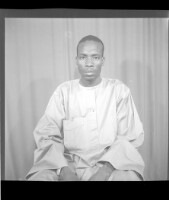 Photo of seven men, four in front, two in chairs and shirts and pants and one in glasses sitting facing forward, the other in profile, and two others in boubous and hats sitting in profile, three men behind them in dress shirts, the man in the middle hold