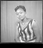 202. EAP449/2/12/202 Reference (shelfmark): EAP449/2/12/202 Title: A woman in a dress, pagne, and headscarf and necklace standing in profile in the studio. Collection Area: Endangered Archives Programme Languages: Not applicable Date Range: 2nd half od the 20th century Extent: 1 TIFF image