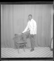 209. EAP449/2/12/209 Reference (shelfmark): EAP449/2/12/209 Title: A man in a dress shirt and pants posing with one foot on a chair standing in profile in the studio. Collection Area: Endangered Archives Programme Languages: Not applicable Date Range: 2nd half od the 20th century Extent: 1 TIFF image