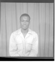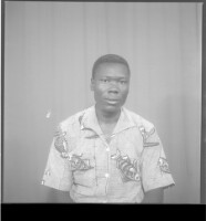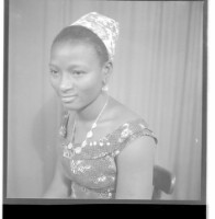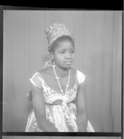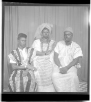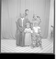 Photo of a family of five: a man in a large boubou and hat next to a woman in a dress, pagne, and headscarf holding a baby on her lap, all sitting facing forward, and a little boy in the middle of them and a man in a dress shirt bent over behind them in