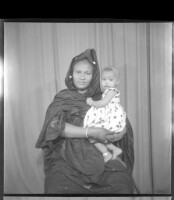 265. EAP449/2/12/265 Reference (shelfmark): EAP449/2/12/265 Title: A woman in a large dress and headscarf sitting in profile holding a baby in her hands in the studio. Collection Area: Endangered Archives Programme Languages: Not applicable Date Range: 2nd half od the 20th century Extent: 1 TIFF image