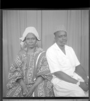 269. EAP449/2/12/269 Reference (shelfmark): EAP449/2/12/269 Title: A man in a dress shirt and hat sitting in profile with her back to the camera, and a woman in a dress, headscarf, and necklace sitting facing forward in the studio. Collection Area: Endangered Archives Programme Languages: Not applicable Date Range: 2nd half od the 20th century Extent: 1 TIFF image