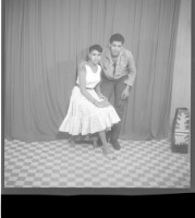 272. EAP449/2/12/272 Reference (shelfmark): EAP449/2/12/272 Title: A man in a dress shirt, pants, necklace, and bent over facing forward holding a woman in a large skirt on a stool sitting in profile in the studio. Collection Area: Endangered Archives Programme Languages: Not applicable Date Range: 2nd half od the 20th century Extent: 1 TIFF image