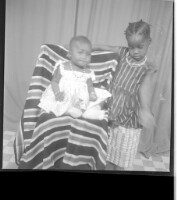 275. EAP449/2/12/275 Reference (shelfmark): EAP449/2/12/275 Title: A little girl in a dress and skirt standing in profile next to a baby in a dress sitting in profile in a chair in the studio. Collection Area: Endangered Archives Programme Languages: Not applicable Date Range: 2nd half od the 20th century Extent: 1 TIFF image