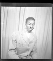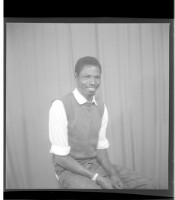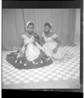 A man in a jacket in the middle of two girls in dresses, one in a headscarf and necklace sitting facing forward and the other sitting in profile in the studio.