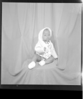 Photo of a family of five: A woman in a dress and headscarf sitting facing forward in the middle of two boys in boubous, one standing in profile and the other facing forward in front of a girl in a dress and necklaces standing facing forward next to anoth