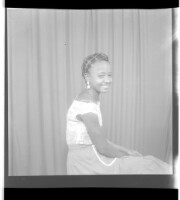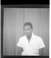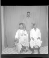 A man in a t-shirt standing in profile holding the shoulder of a woman in a dress, headscarf, and necklace holding a baby sitting facing forward in the studio.