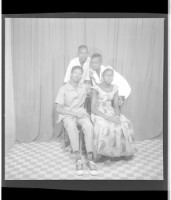 Photo of four people: a man in a dress shirt and pants sitting facing forward next to a woman in a dress and headscarf sitting in profile in front of two men in dress shirts, one bent over in profile and the other standing facing forward behind in the stu